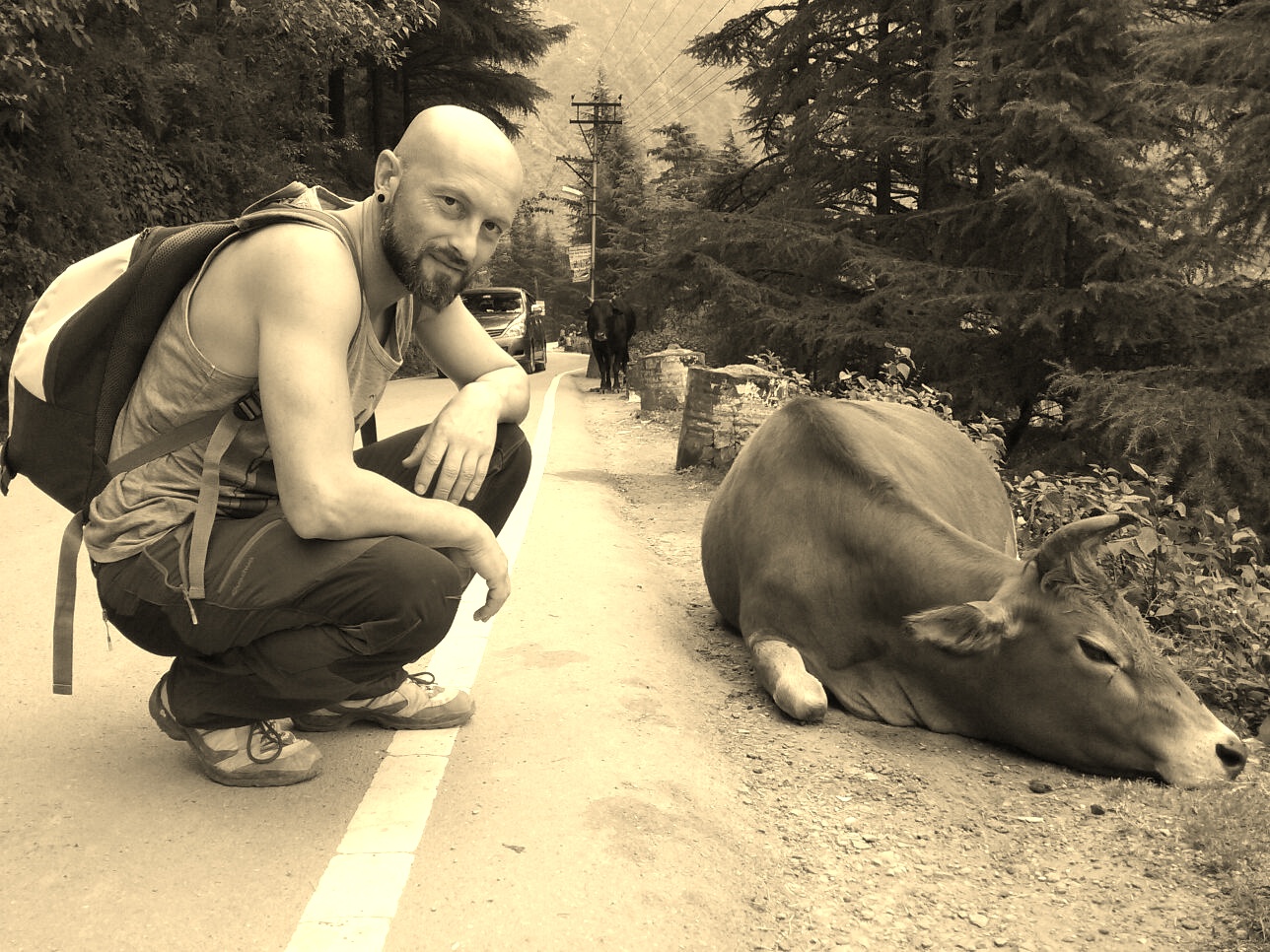 Jou junto a una vaca en India, durante su viaje solidario.