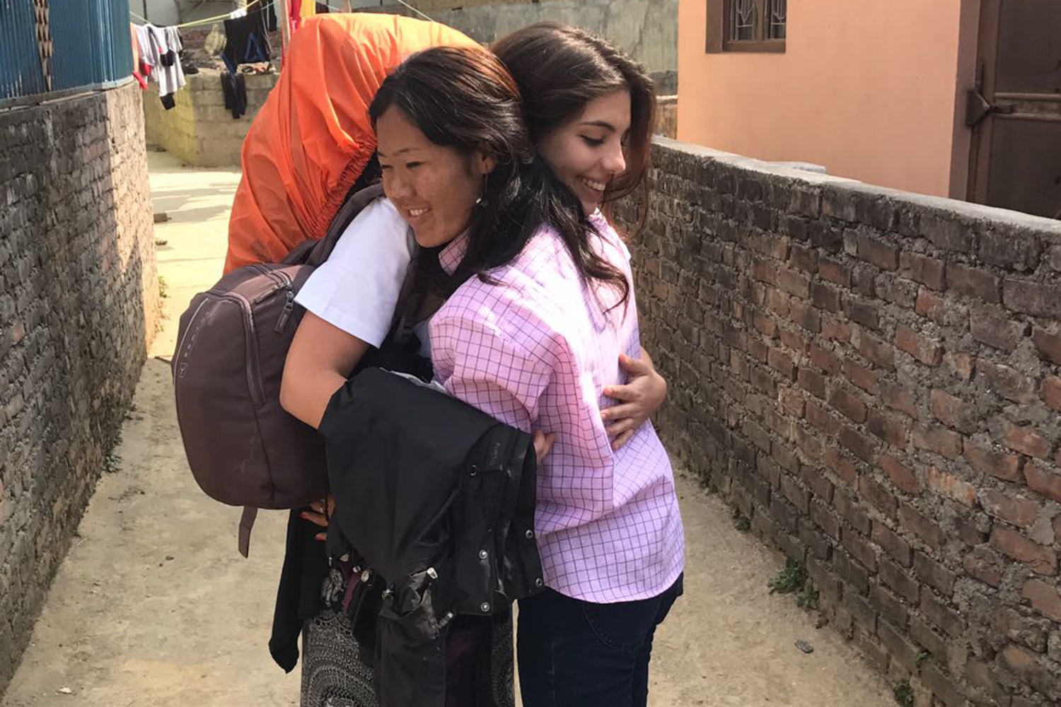 | Cardigan in Nepal with a large backpack and a small one for day to day. |