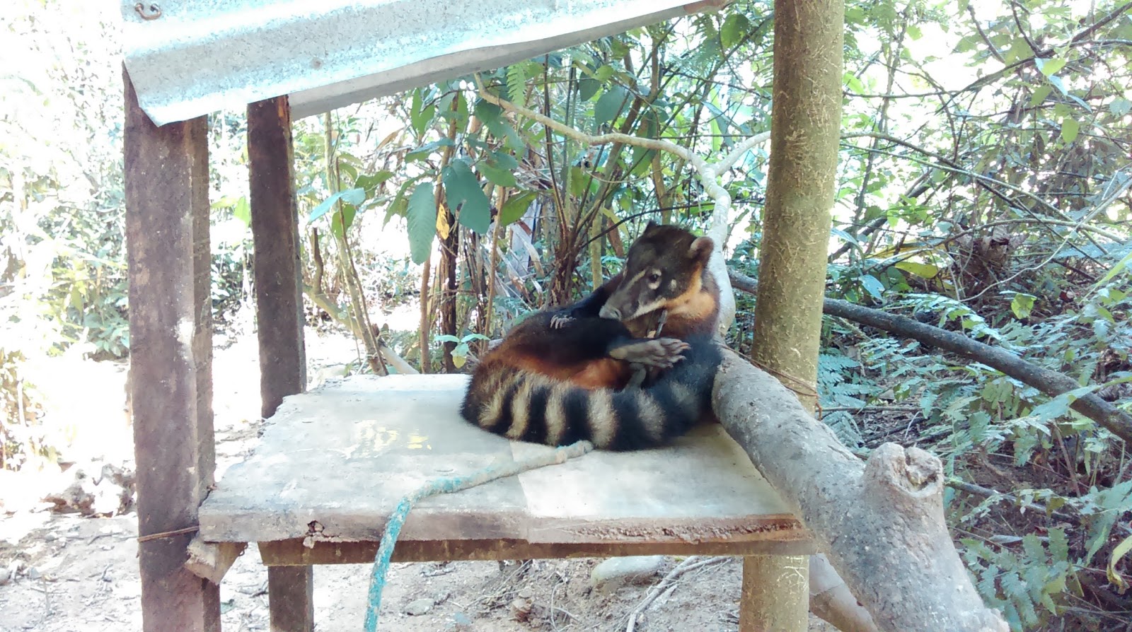 We got up at 6:30 a.m. and went to prepare the food for the animals together with the other volunteers. At 7:10 we had breakfast in the small cafeteria and at 7:40 we went up to our respective areas with food and other belongings. Until 12:30 or so, we worked in the area. We fed the animals (Bolivian badgers, in my case), we cleaned their cages, we walked them through the jungle until we reached some very long ropes, tied between two trees, where we hooked their leashes and they were entertained throughout the morning, sniffing the ground... And many other things, we didn't stop!